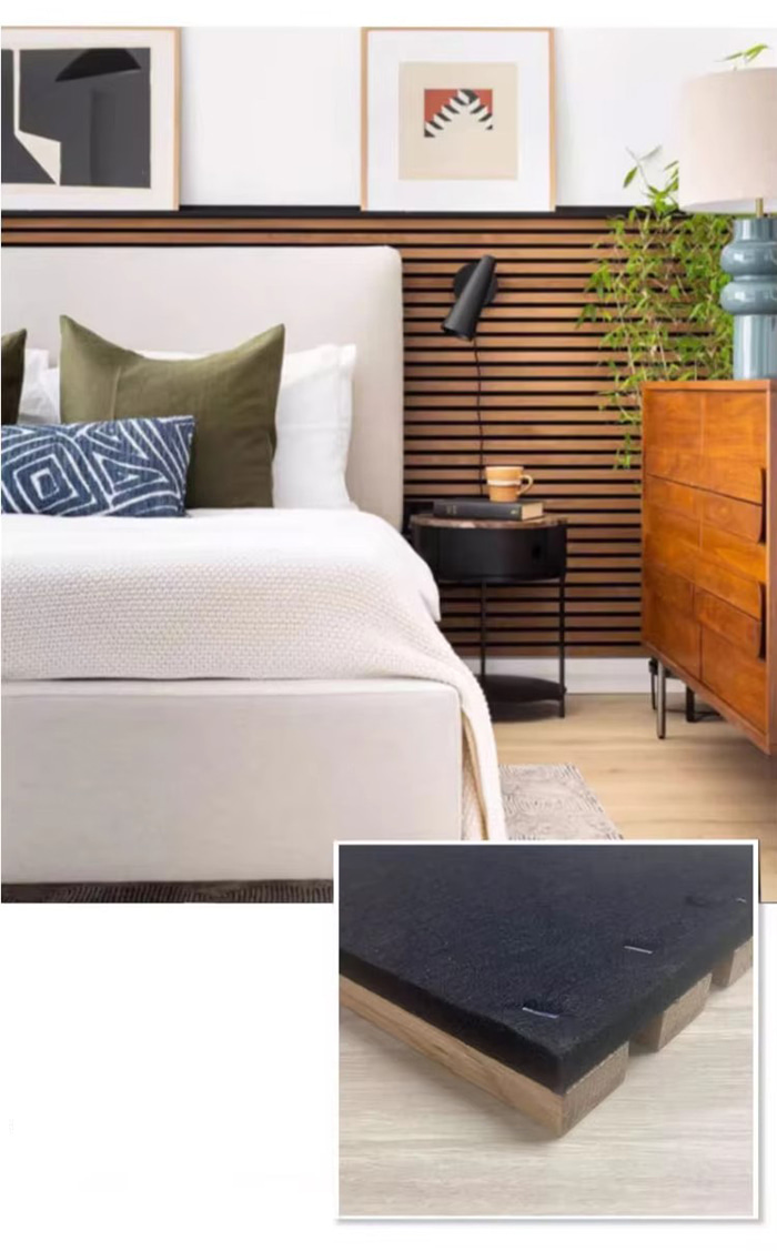 Porézna vrstva: Drevené vlákno a zvuk pohlcujúca bavlna sú zložené, s pórovitosťou ≥ 30 % a distribúciou veľkosti pórov 0,5 – 2 mm na optimalizáciu absorpcie zvukových vĺn.
